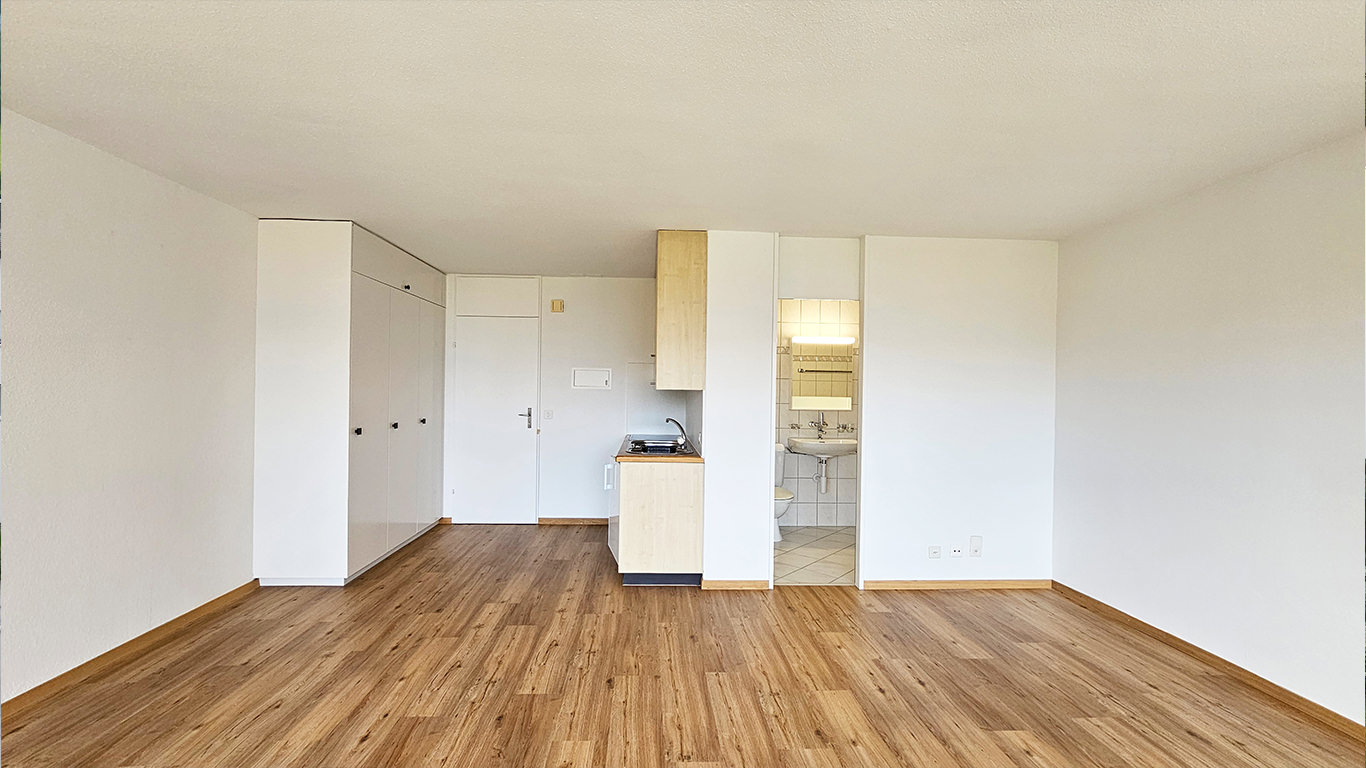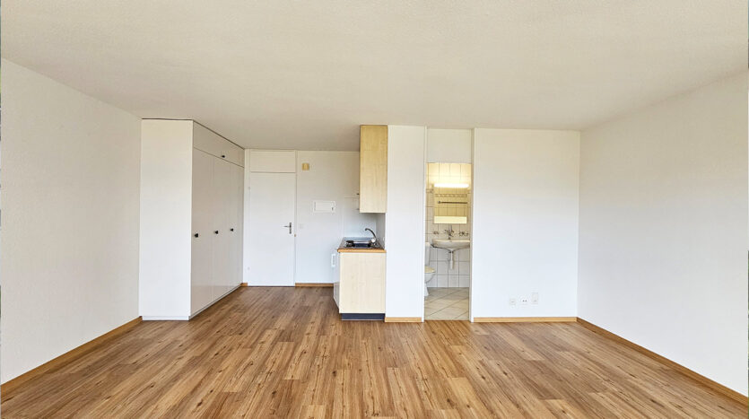 Offene Küche mit neuen Geräten und Einbauschrank, Wohnschlafzimmer mit neuem Parkettboden und frisch gestrichenen Wänden, Bad mit Dusche und falls gewünscht mit neuwertiger Waschmaschine